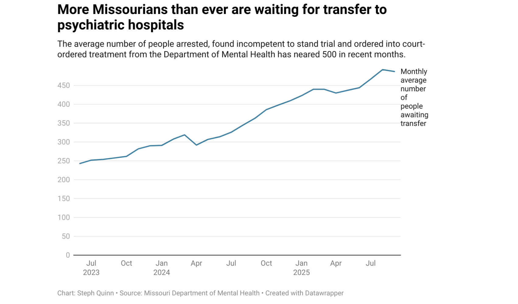 In September, an average of 487 Missourians were waiting for a bed in a psychiatric hospital run by the department. The waitlist has grown by a third since September 2024 and almost 88% since September 2023.